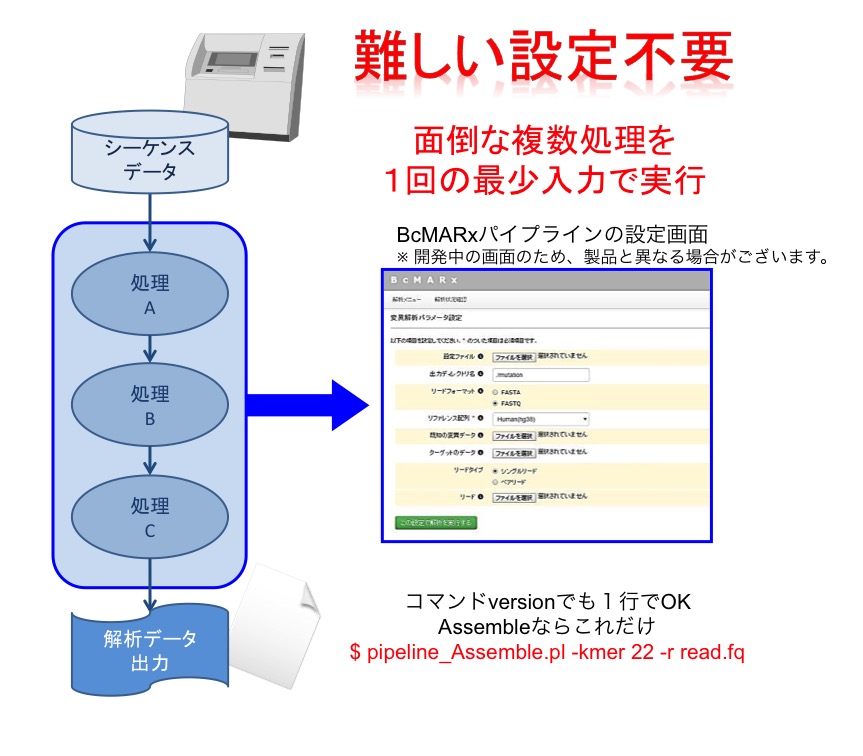 複雑な Linux コマンド操作を行うことなく、1度の設定で全ての解析フローを実行、結果を出力します。