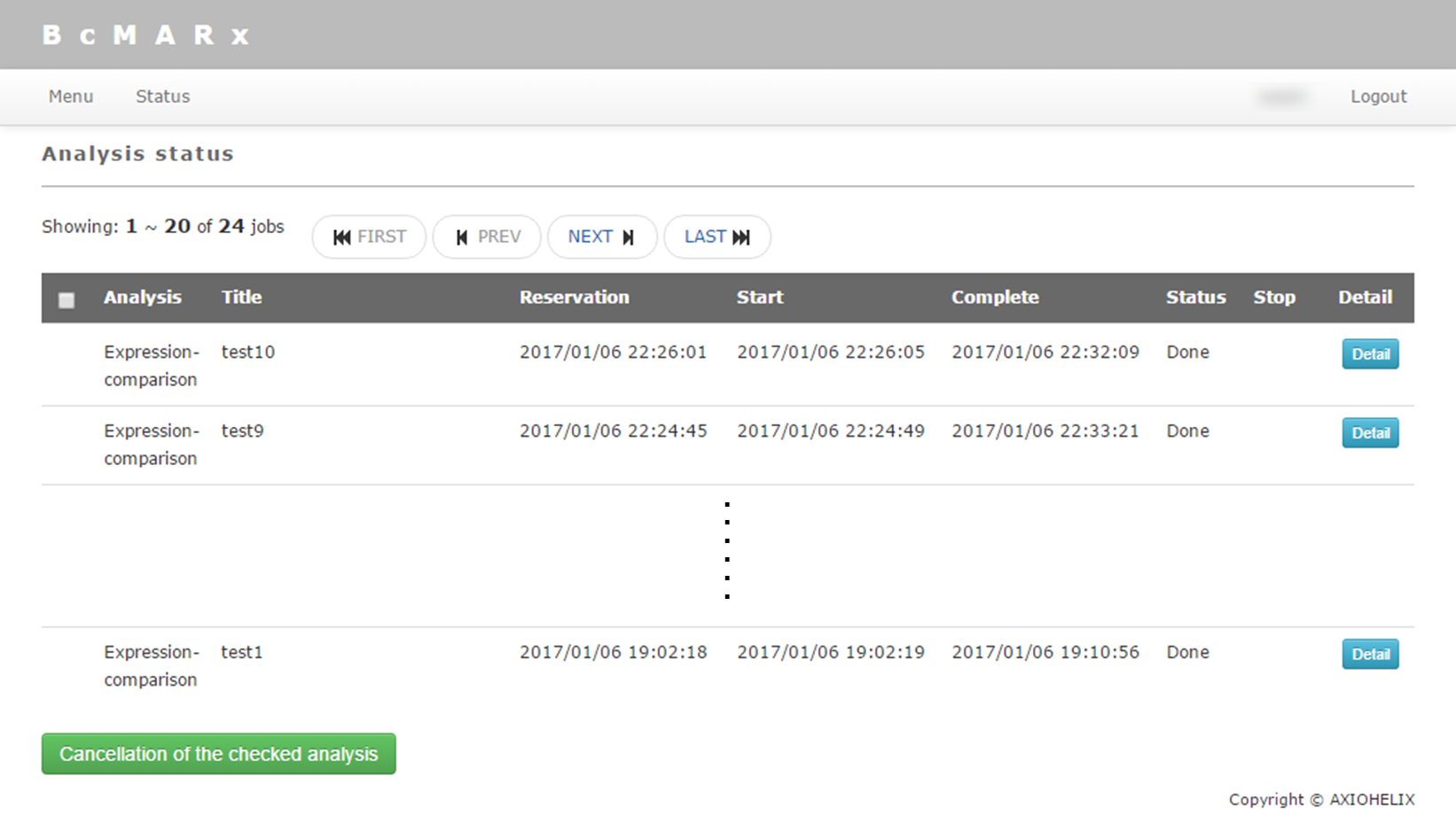 メニューバーに表示されている「Status」から今までに予約した解析の一覧を見ることができます(解析の予約までのフローはこちら)。