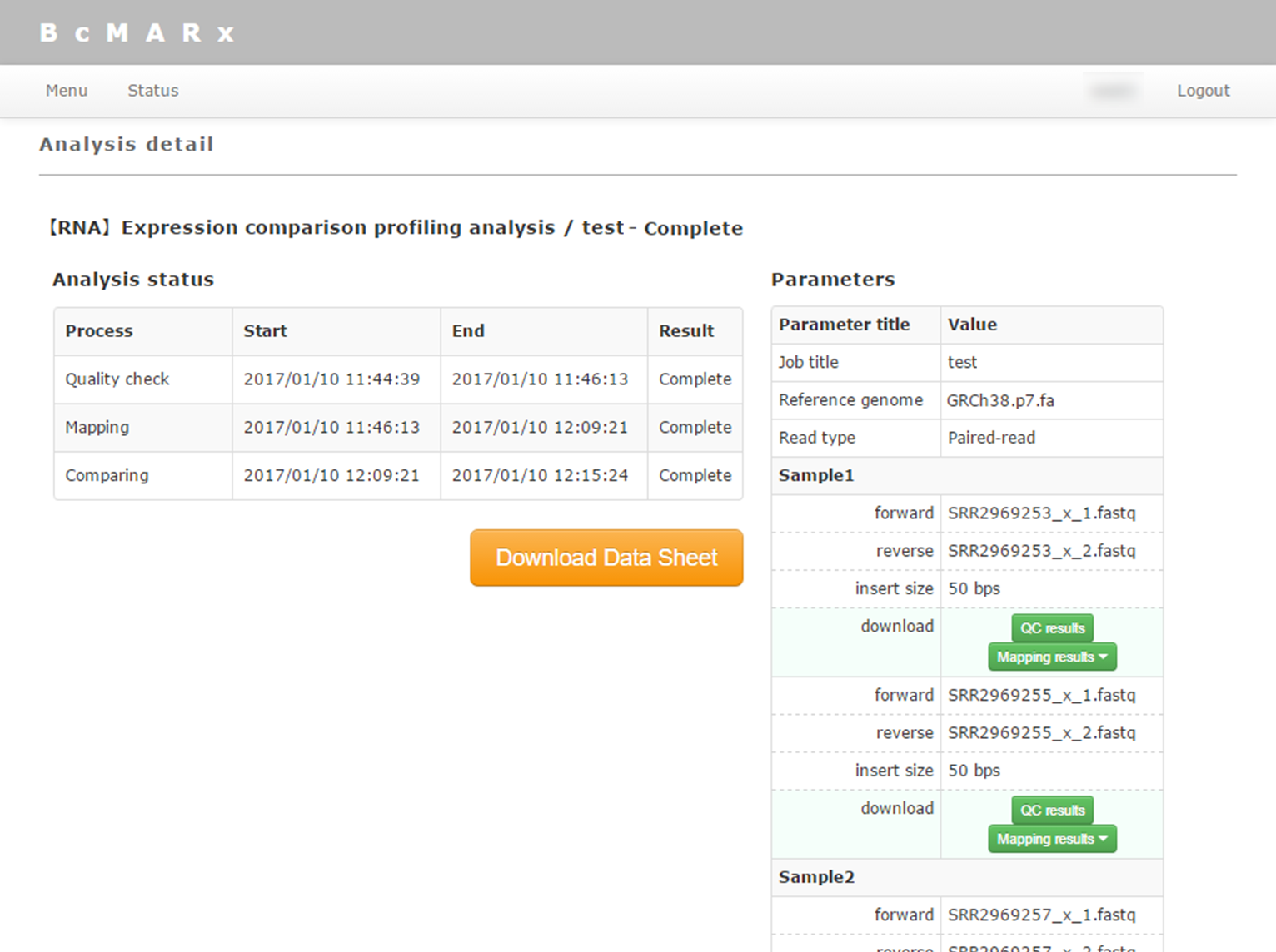 ![]() ”RNA-Seq発現量比較データ作成サービス”においての解析段階は3つに分かれており、表の上から順に実行されていきます。「Quality check」が完了したときは右表の各サンプルの欄に”QC results”ボタンが表示され、結果をダウンロードすることができます。「Mapping」完了時は同様の箇所に”Mapping results”ボタンが表示され、結果をダウンロードすることができます。「Comparing」まで完了した際は表の下に”Download Data Sheet”ボタンから最終結果の表がダウンロードできるようになります。それぞれのファイルサンプルはこちらにございます。 |