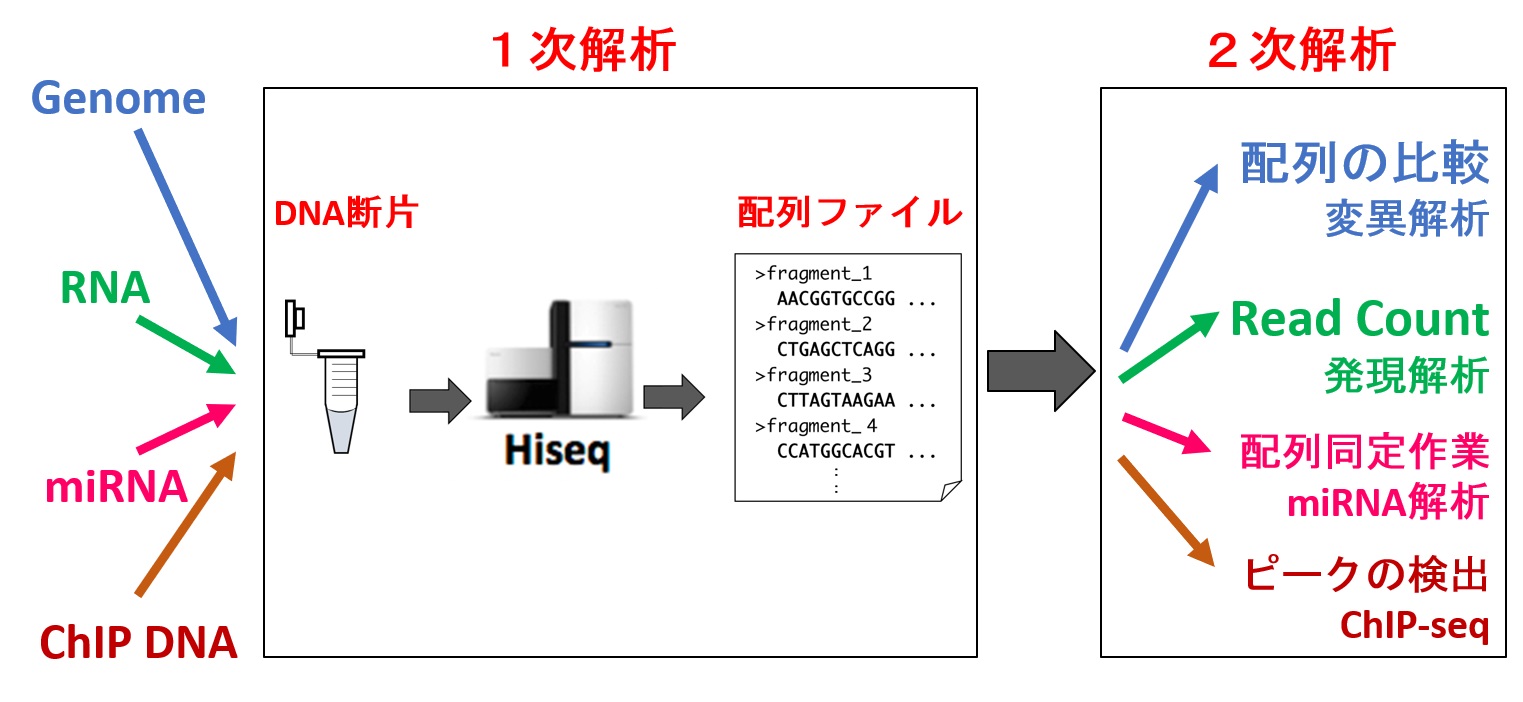 - 一次解析で得られるのは配列データのみである為、考察できるように計算を行います。非常に大量の配列が得られるため、コンピュータの計算にて実行します。