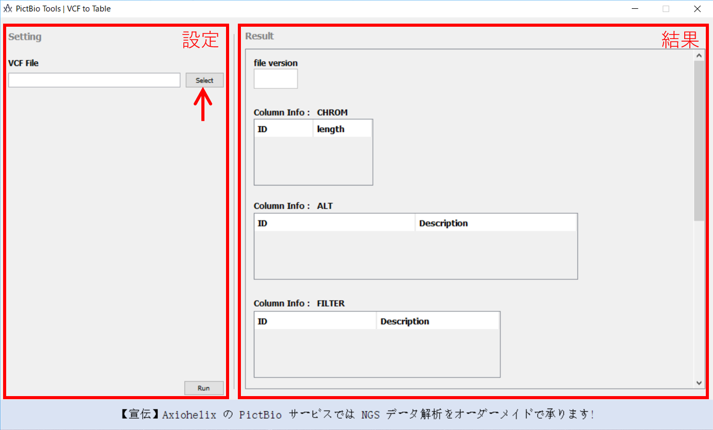 起動後の画面は以下のようになっております。左の設定領域と、右の結果表示領域にわかれています。先ずは設定領域にある「VCF File」の「Select」ボタンを押してください。