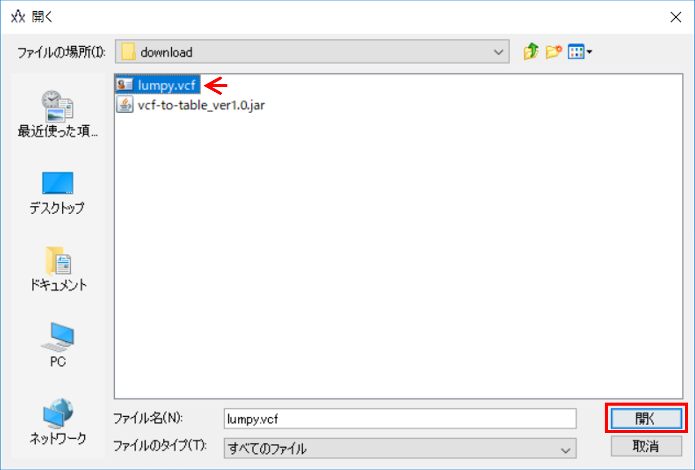 ファイル選択のダイアログが開くので、VCF ファイルを選択して「開く」を押してください。
