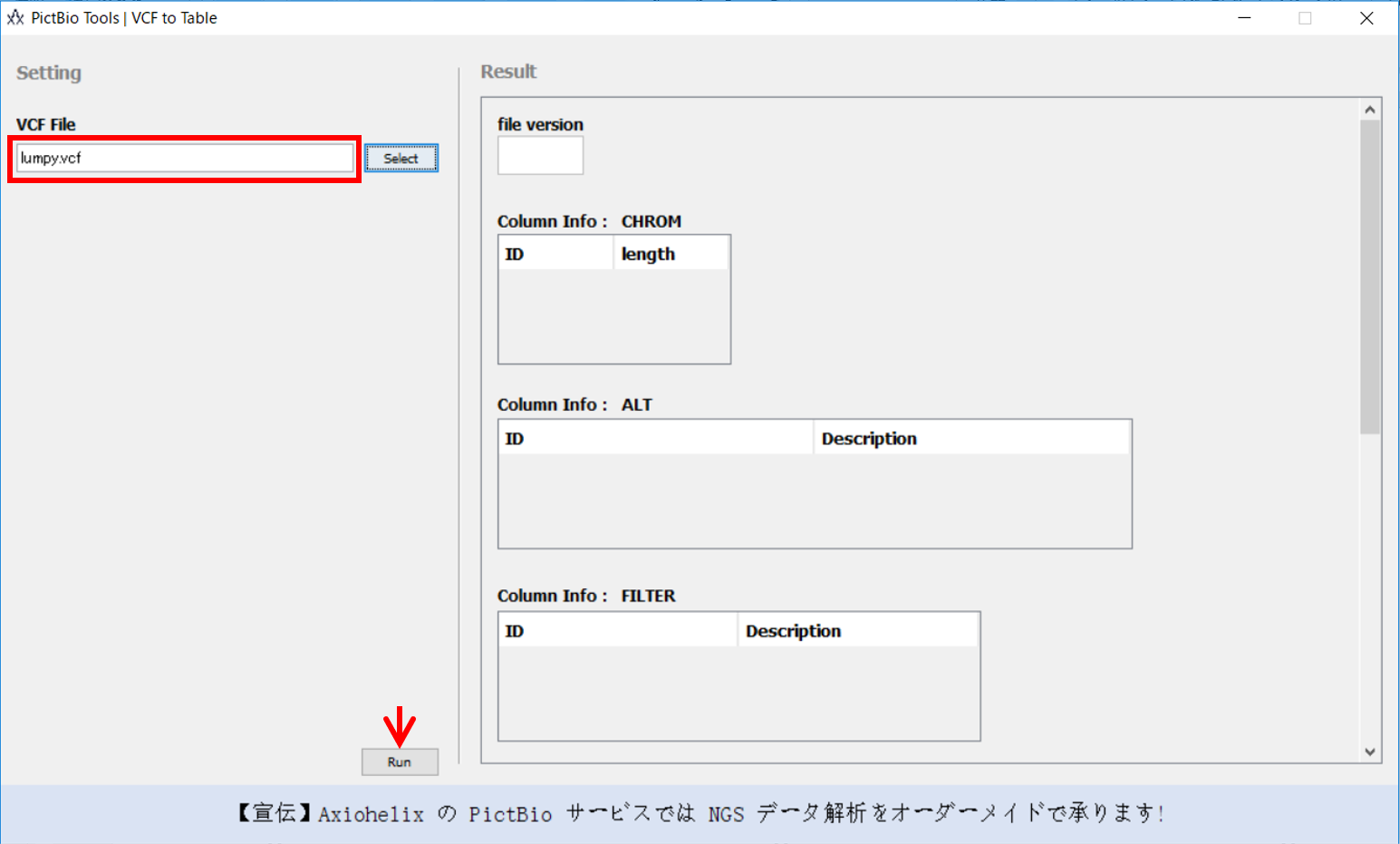 ファイルを選択したらファイル名が表示されます。左の設定領域にある「Run」ボタンを押すことで実行が行われます。