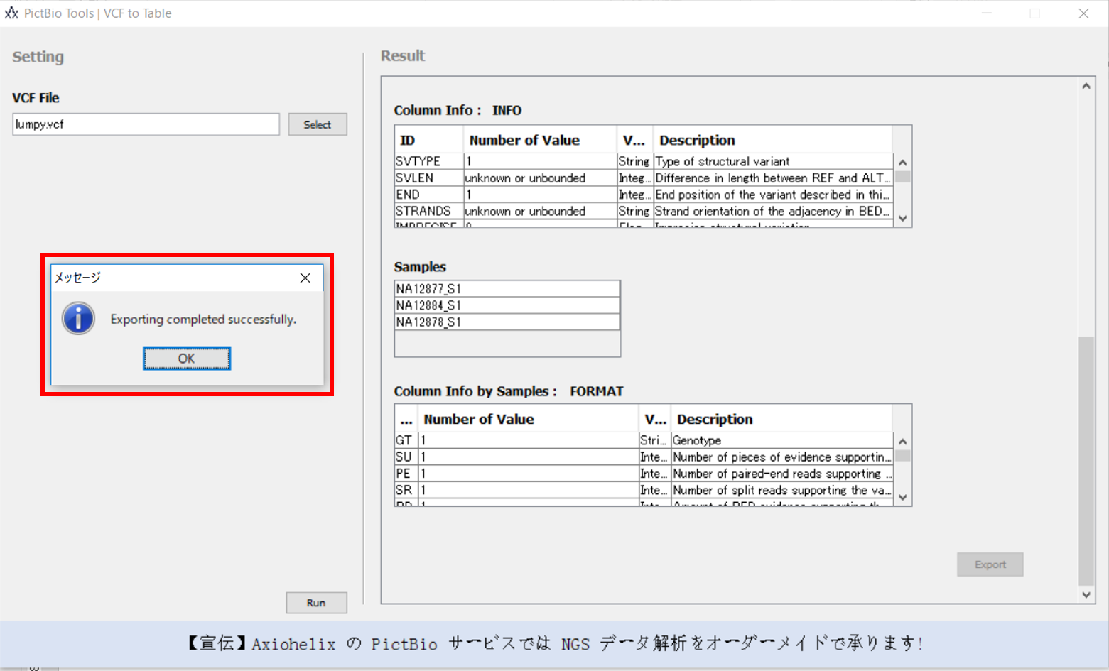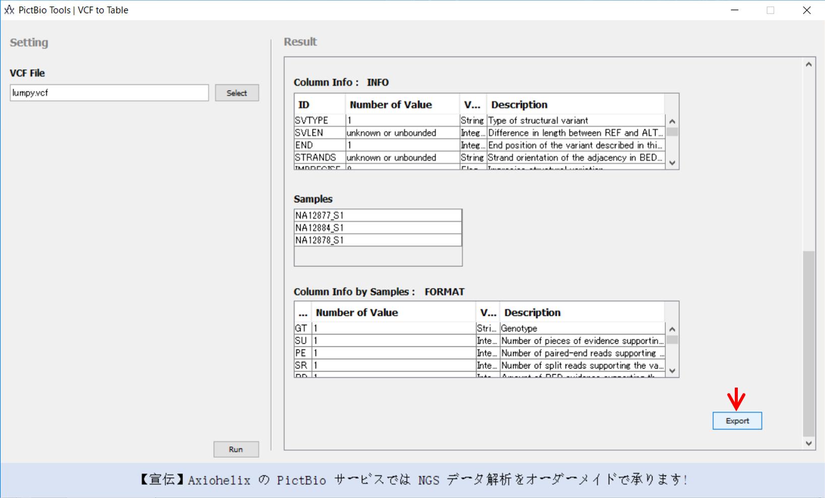 サンプルカラムもサンプルごとに、複数タグ情報が1カラムに収まっていたものを分割して表示します。各カラムが何を表すかは、ツールの右の結果表示領域の「Column Info by Samples : FORMAT」で確認できます。
