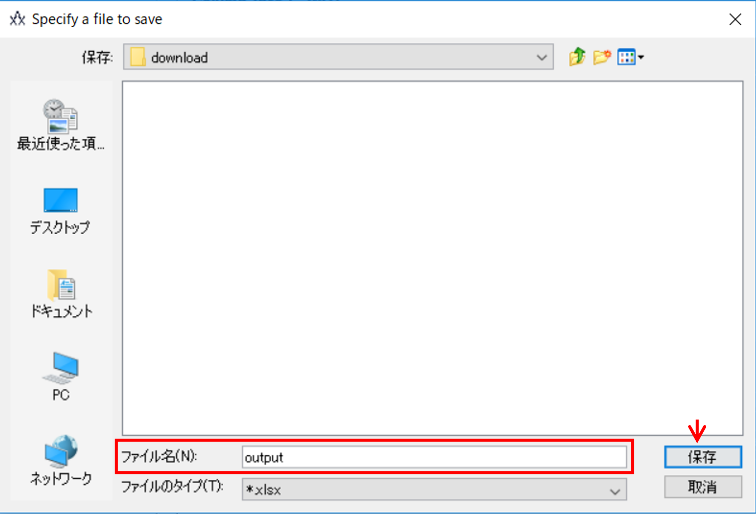 開いたダイアログにファイル名を記入し「保存」ボタンを押すことで出力が実行されます。
