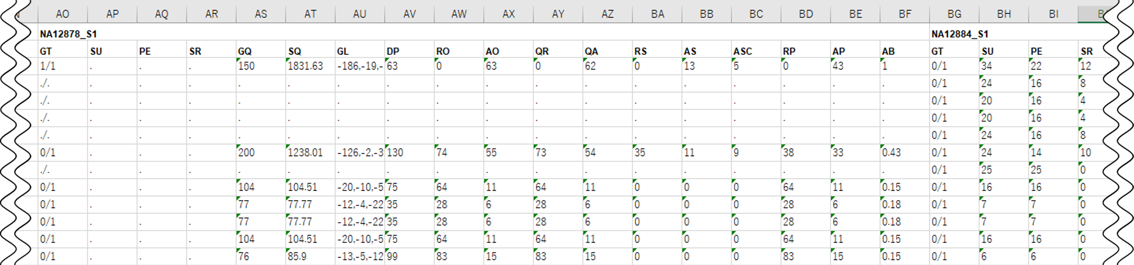 | Column Info by Samples : FORMAT | サンプルの変異情報カラムに格納されている値のタグとその説明。表ではタグごとカラムが作成される。 |